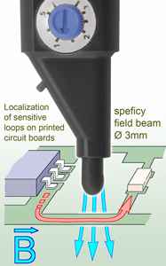 Conventional generators and test stations can be used to determine whether a device complies with the standard noise immunity required by law. Weak spots on an assemby can not be precisely located. Detailed information about their location, their susceptibility, and type of action (E-field or B-field susceptibility) are required to easily and efficiently locate them on the printed circuit board and eliminate them. Mini burst field generators are handy and can be used at the developer’s own workspace.