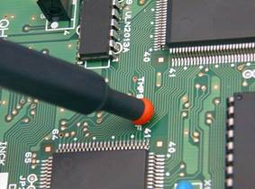 E-field-sensitive weak points cannot be identified with H-field sources. Special E-field probes have to be used to localise these weak points. Apart from conductor run sections, high-resistance components such as pull-up resistors or quartz generators may also prove critical in this respect.