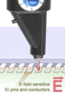The coupling takes place capacitively inside the field generator. The tip of the P23 mini generator is positioned galvanically on the pins or signal lines to be tested. Conventional generators and test stations can be used to determine whether a device complies with the standard noise immunity required by law. However, weak spots on an assemby can not be presicely located. Detailed information about their location, susceptibility, and type of action (E-field or B-field susceptibility) are required to easily and efficiently llocate them on the printed circuit board and eliminate them. Mini burst field generators are handy and can be used at the developer’s own workspace.