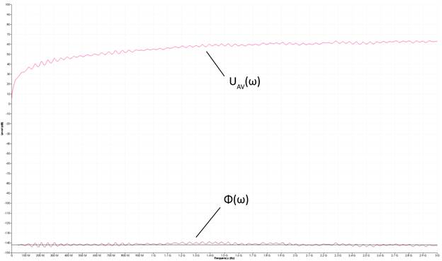 Es ist zu erkennen, dass der Flussanteil Φ(ω) im Bild 14 geringe Abweichungen vom linearen konstanten Verlauf (-141,8 dBµVs) besitzt. Ebenso besitzt die Spannung UAV(ω) Welligkeiten. Die idealen Werte von UAV(ω) (Bild 15) lassen sich aus Gl 1 und Gl 7 und den Werten IIC(ω) = 57 dBµA konstant und Lh = 0,108 nH berechnen.