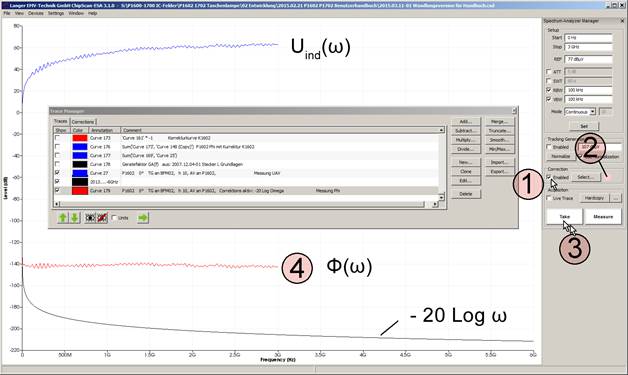 Im Bild 14 ist die vom Spektrumanalysator gemessene Spannung UAV und der aus Gl 13 berechnete Fluss Φ(ω) = UAV(ω) – 20 Log ω dargestellt.