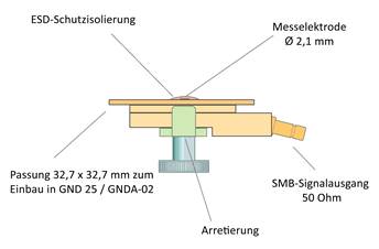 Die Messanordnung abgeleitet aus Bild 5 und Bild 8 ist in der Prüfeinrichtung (Bild 9) enthalten. Sie besteht aus dem Test-IC, der Testleiterkarte, dem Groundadapter, dem Distanzring und dem Boden der Feldsonde mit Elektrode bzw. Stromleiter. Diese Teile bilden einen geschirmten Raum, der als Feldkammer bezeichnet wird.