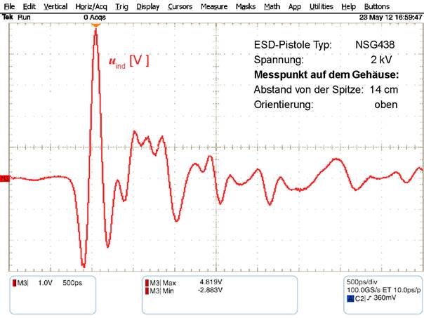 Im ESD-Generator werden beim Entladevorgang am Hochspannungsschalter, an Stromleitern und weiteren Bauteilen Schaltspannungen mit hoher Flankensteilheit entstehen (Bild 1). Diese Schaltspannungen erzeugen elektrische Felder hoher Flankensteilheit, die aus dem Generatorgehäuse auf den Prüfling auskoppeln. Im Bild 6 ist das elektrische Feld dargestellt, dass im hinteren Bereich aus dem Gehäuse eines ESD-Generators austritt. Die Flankensteilheit ist ca 1 ns.