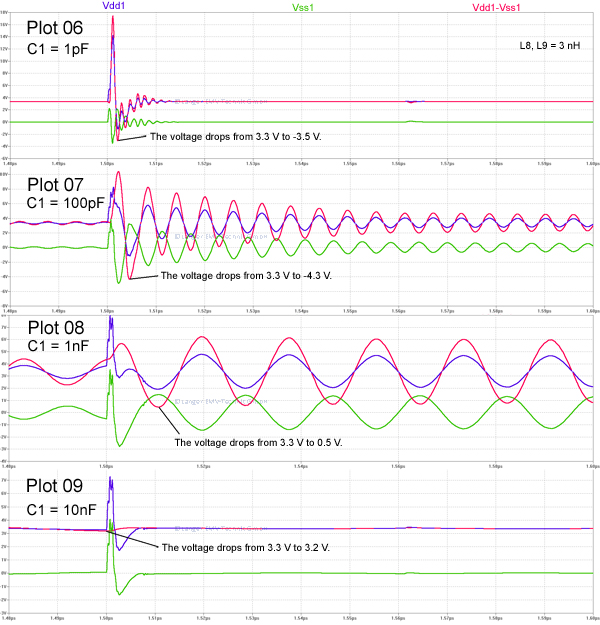 | C1 = 1pF: | The disturbance pulse dominates and generates pulse-shaped voltage differences between Vdd and Vss (plot 06). |
