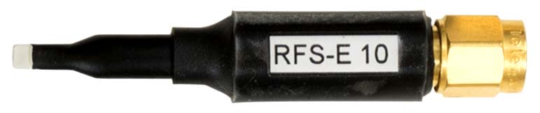 The RFS-E 10 is a passive near-field scanner probe. For measurements the E-field probe is positioned above the components or areas of the PC board. The near-field probe has a sheath current attenuation and is electrically shielded. It can be connected to a spectrum analyzer or an oscilloscope with a 50 Ω input. The E-field probe does not have a 50 Ω terminating resistor internally.